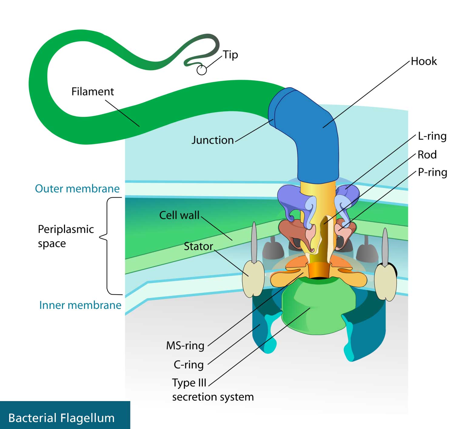 The flagellum is the means by which the bacterium swims. It consists of a whip-like tail attached to a motor and rod that spin the tail, acting very much like an outboard motor and propeller on a boat. The motor resembles a man-made engine, only it is powered by proton flow rather than gas, with a drive shaft, bushings, stator, and clutch. The parts fit together precisely, and the core parts are essential for function—if one is removed, the whole thing ceases to work. Present-day flagella are composed of 30–50 proteins, depending on the bacterial species. Twenty proteins are part of the core function.