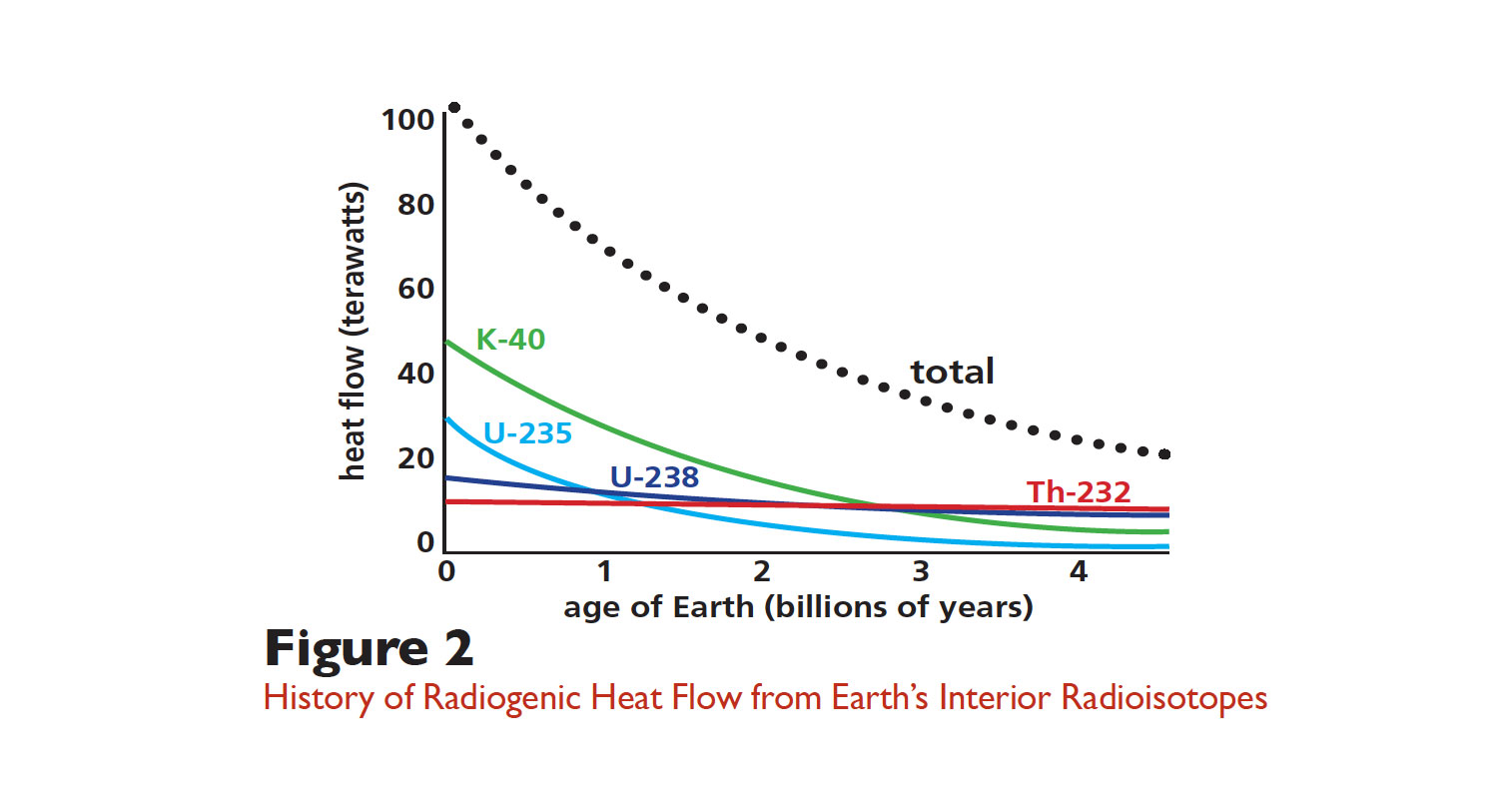 When Earth was less than 100 million years old, its radiogenic heat was dominated by several short-half-life radioisotopes. Since then, just four radioisotopes—potassium-40, thorium-232, uranium-235, and uranium-238—have accounted for more than 99 percent of Earth's radiogenic heat. Figure 2 shows the relative contributions of potassium-40 (K-40), thorium-232 (Th-232), uranium-235 (U-235), and uranium-238 (U-238) to Earth's internal heat flow throughout the past 4.5 billion years.